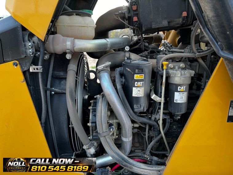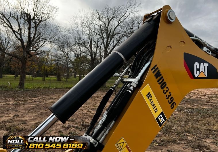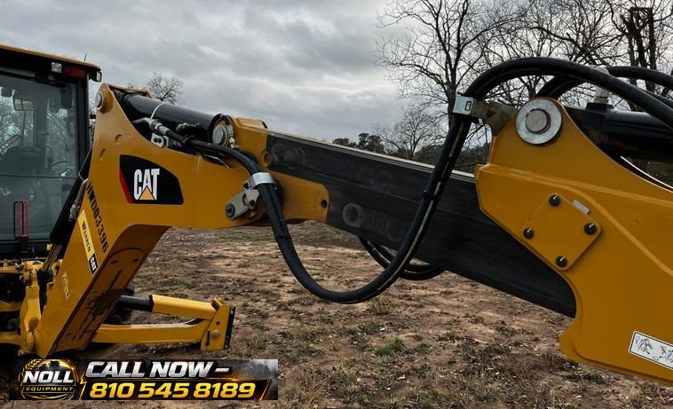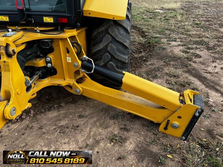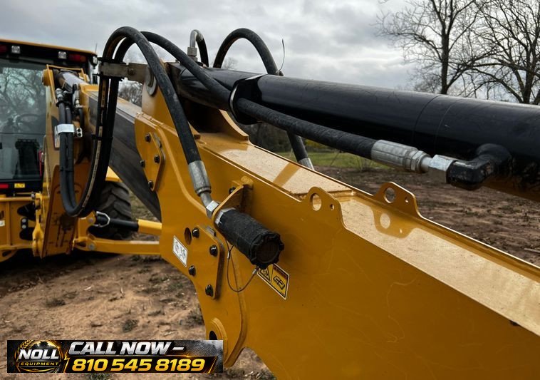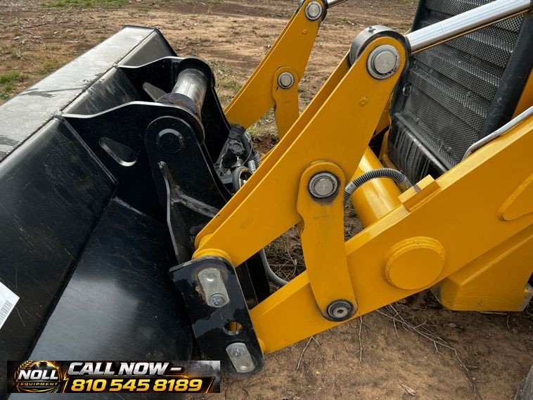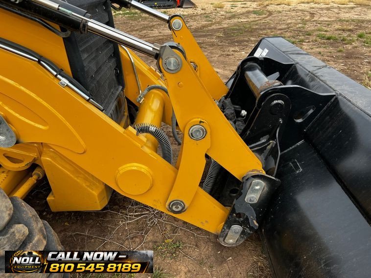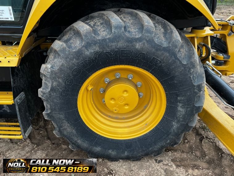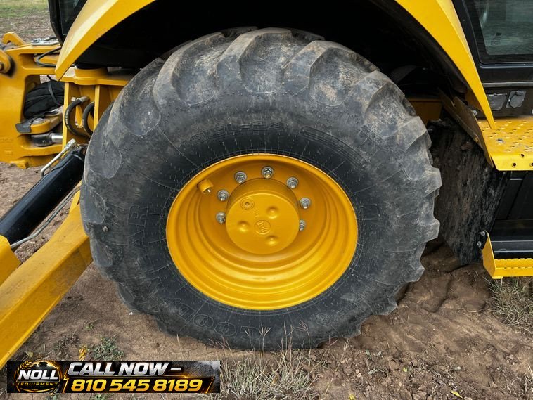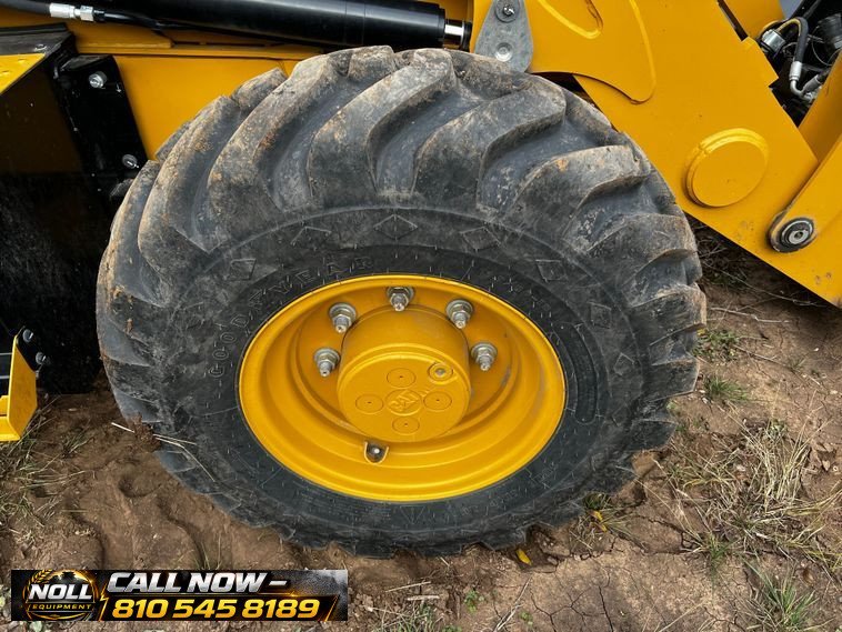 The backhoe features an extendable stick, hydraulic quick coupler, auxiliary hydraulics, and a 24″ Caterpillar bucket with 5 teeth and weld-on cutting edge. Rides on Goodyear tires: 12.5/80-18 front and 19.5L-24 rear.