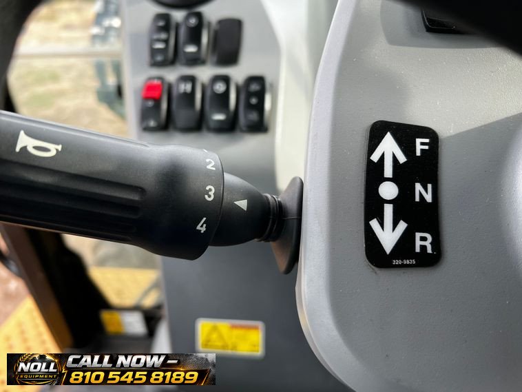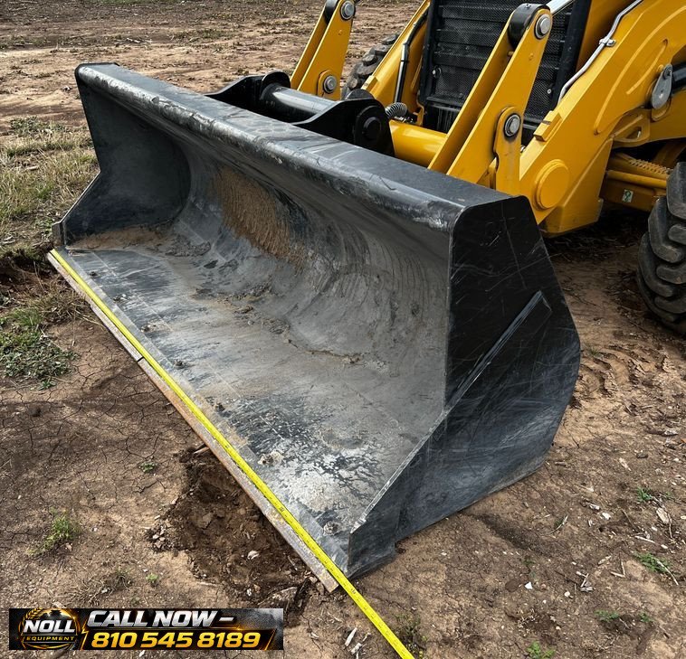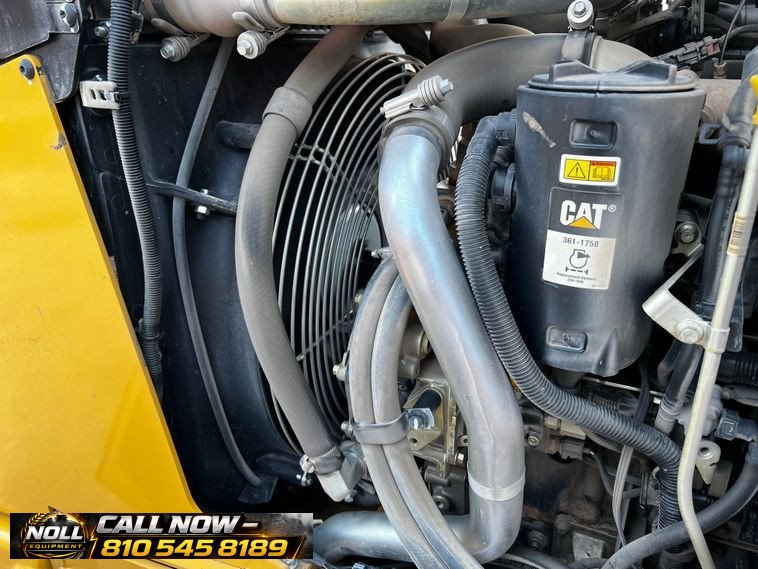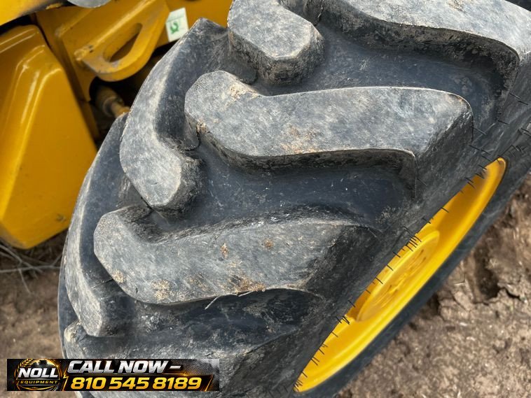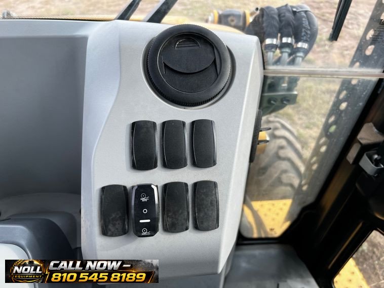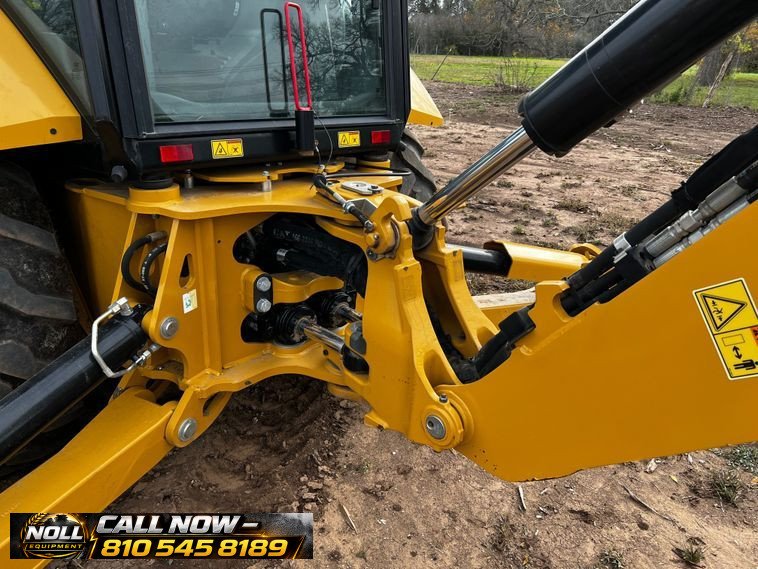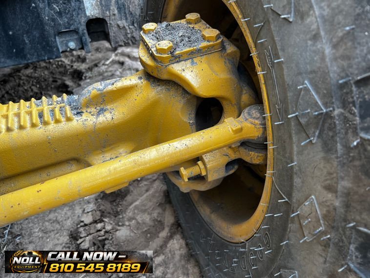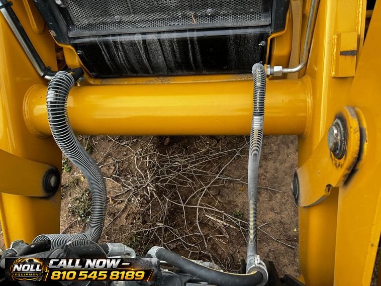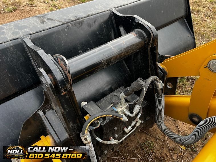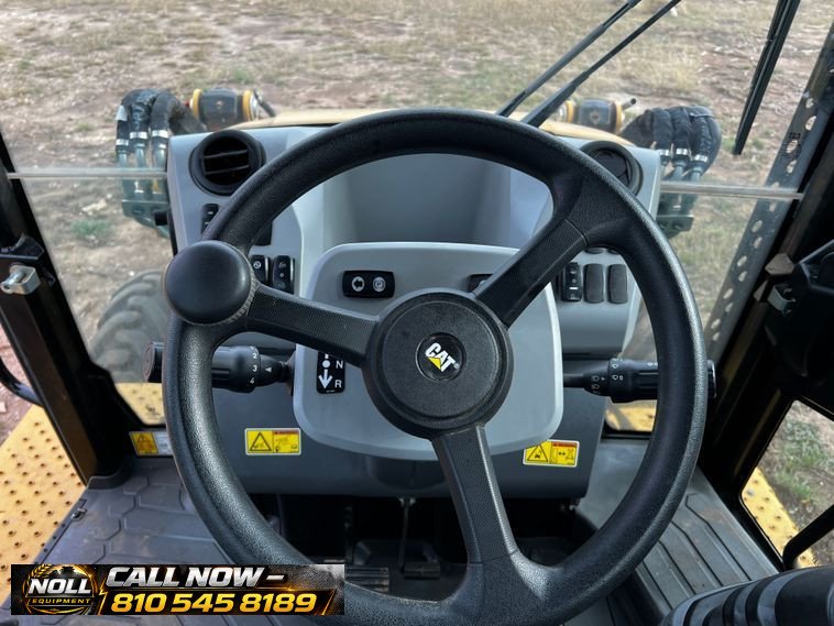 The backhoe features an extendable stick, hydraulic quick coupler, auxiliary hydraulics, and a 24″ Caterpillar bucket with 5 teeth and weld-on cutting edge. Rides on Goodyear tires: 12.5/80-18 front and 19.5L-24 rear.